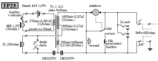 Einer der am weitesten verbreiteten Feldfernsprecher ist der TP-25 der damaligen tschechoslowakischen Armee. Lediglich durch eine 1,5 Volt Batterie versorgt, überbrückt er mittels einfachem zweiadrigem Feldkabel eine Distanz von mindestens 30 Kilometern. Das Feldtelefon wird mit einer Original-Primärzelle vom Typ AS 4 (1,4 Volt) oder einer handelsüblichen 1,5 Volt Batterie betrieben. Bitte keine höheren Spannungen anlegen da die Original-Mikrofonkapsel über längere Zeit hinweg Schaden